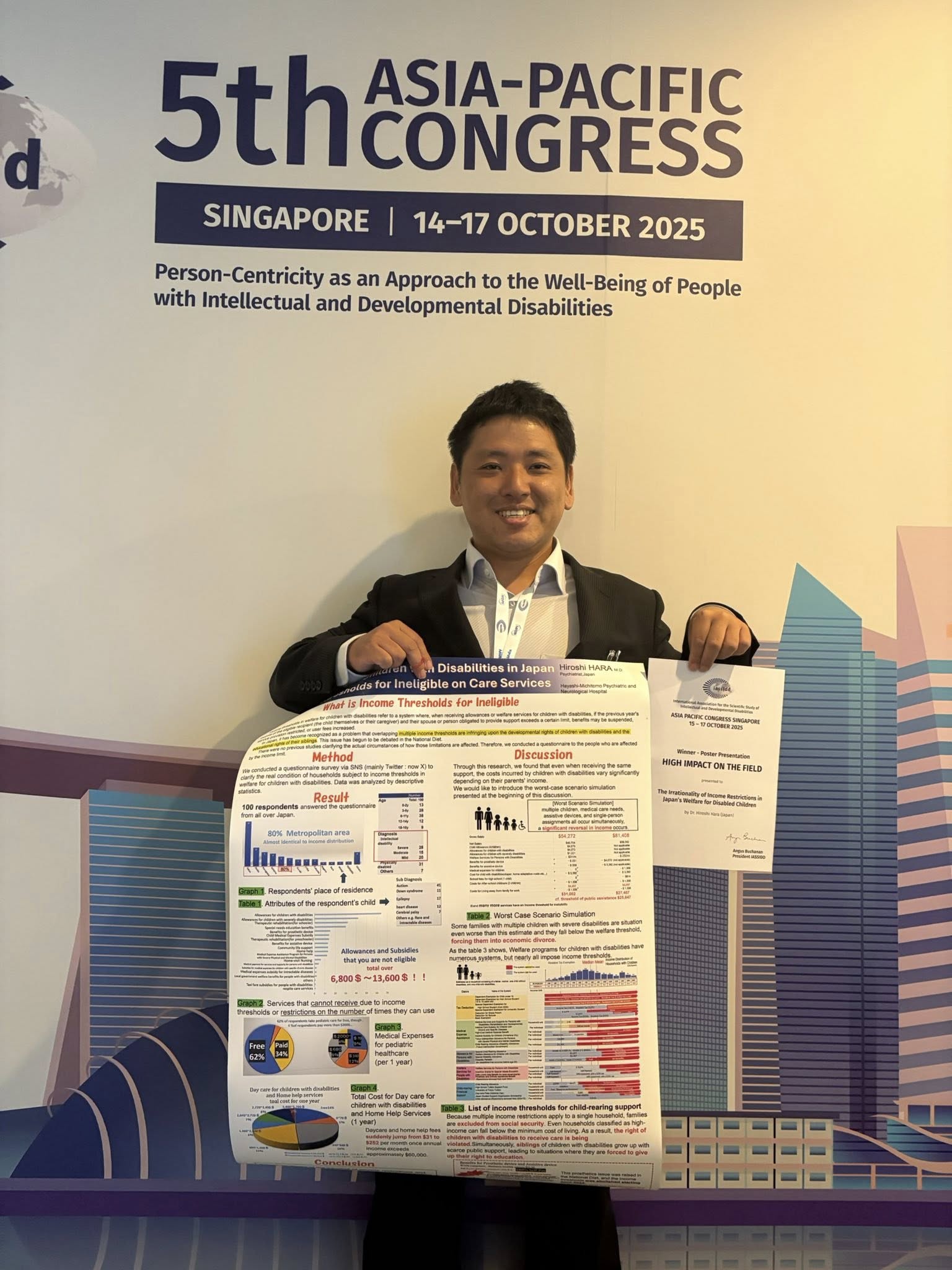 10/15~17にシンガポールで行われた「国際知的・発達障害学会」に原紘志医師が参加し、「日本における障害児の権利侵害:介護サービス受給資格喪失の所得基準」と題してポスター発表しました。